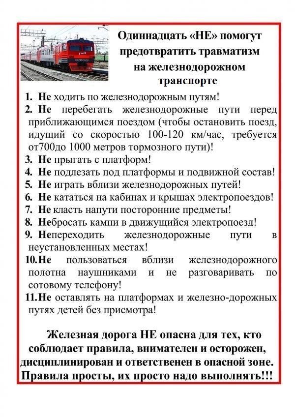 Особое внимание на разъяснение детям правил нахождения на железной дороге. Основной трагедий становится беспечное, безответственное отношение взрослых к детям. При отсутствии контроля со стороны родителей дети забираются на крыши вагонов, беспечно бродят по железнодорожным путям, катаются на подножках вагонов и просто ищут развлечения на железной дороге.