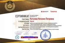 Наталия Петровна 2023 елда VI Милли балалар патриотик иҗаты премиясе кысаларында "Балалар өчен технология дәресләре" Бөтенроссия методик эшләнмәләр конкурсында катнашты. Аның проект эшчәнлеге буенча методик эшләнмәсе "Топ-100 методик эшләнмәләр. Балалар өчен технология дәресләре" китабына кертелде. Электрон басмага сылтама. https://www.patriotpremia.ru/yroki-texno.
