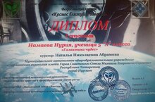5А сыйныф укучысы Нурия Намаеваны котлыйбыз, ул «Якын һәм ерак Космос» Бөтенроссия конкурсының 1 дәрәҗә дипломына лаек булды, җитәкчесе Н. Н. Абрамова.