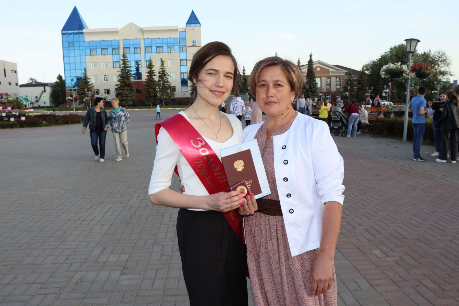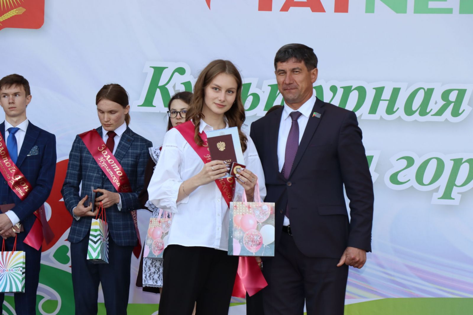На сцене сквера «Театральный» 29 выпускникам школ района в торжественной обстановке вручили аттестаты с отличием и медали «За особые успехи в учебе!».