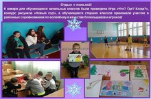 6 января для обучающихся начальных классов была проведена Игра «Что? Где? Когда?», конкурс рисунков «Новый год!», а обучающиеся старших классов принимали участие в районных соревнованиях по волейболу в качестве болельщиков и игроков!