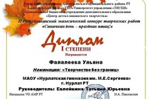 Администрация и коллектив Нурлатской гимназии с большой радостью поздравляют ученицу Ульяну Фалалееву, ставшую победителем II Республиканского экологического конкурса творческих работ «Синичкин день – праздник птиц!».