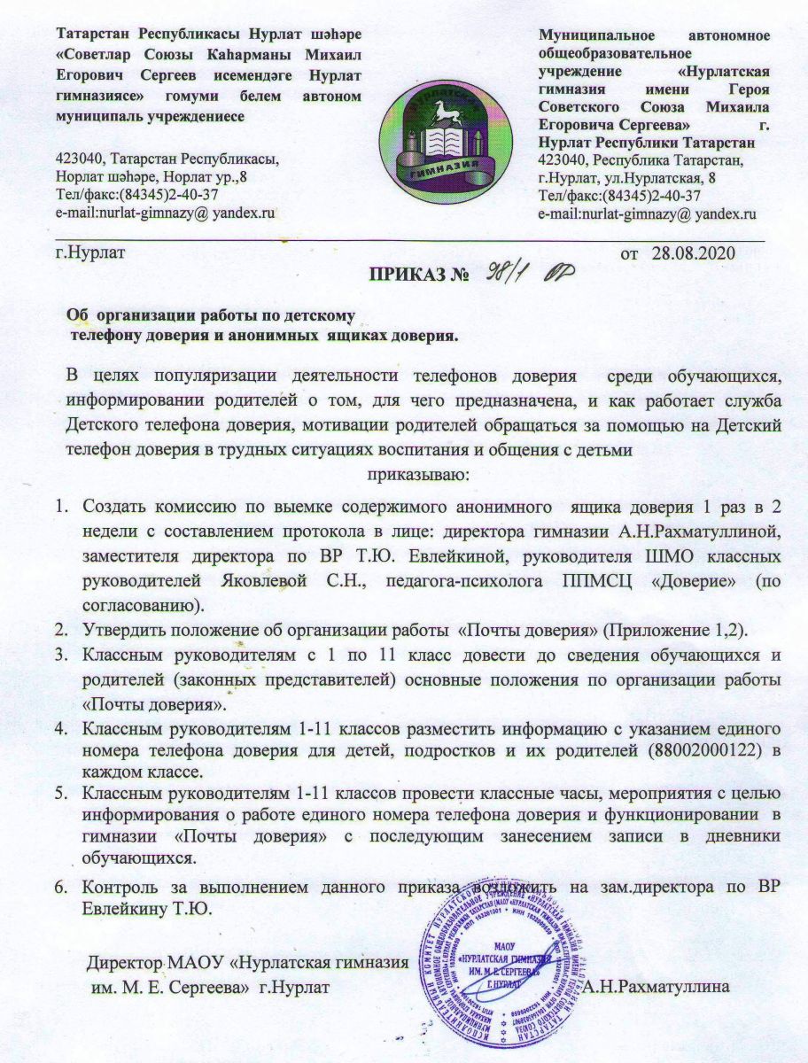 Приказ об организации работы по детскому телефону доверия и анонимных ящиках доверия