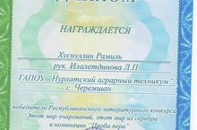 Студент Черемшанского филиала ГАПОУ «Нурлатский аграрный техникум» Хуснуллин Рамиль стал победителем Республиканского литературного конкурса «Этот мир очарований, этот мир из серебра» в номинации «Проба пера».