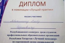16 декабря на базе Казанского торгово-экономического техникума состоялся Республиканский конкурс «Лучший менеджер». Нурлатский аграрный техникум на данном конкурсе представил студент IIкурса – Абакшин Глеб (руководители- Еремеева Ирина Александровна и Ханяфиева Нурсина Салихзяновна). Глеб стал победителем в номинации «Лучший практик». Поздравляем!