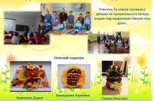 Ученики 7а класса провели с детьми из пришкольного лагеря акцию под названием «Земля наш дом». Цель данной акции:воспитать бережное отношение учащихся к живой природе, обратить их внимание на ту угрозу, которую представляет воздействие человека на окружающую природу; формировать у учащихся познавательный интерес к экологическим проблемам и стремление принять посильное участие в их решении. Так же ребята предоставили на конкурс работы "Осенние поделки"