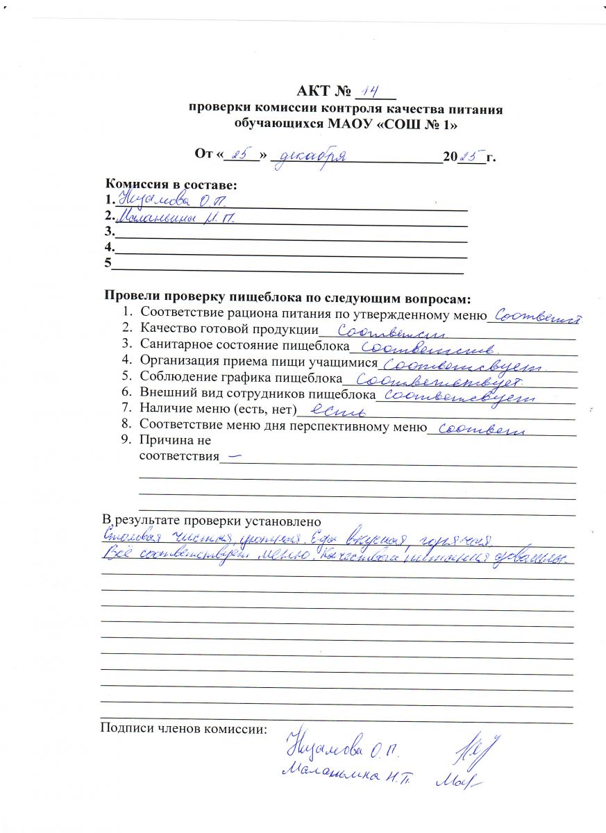 Акт № 25 проверки комиссии контроля качества питания обучающихся МАОУ СОШ № 1