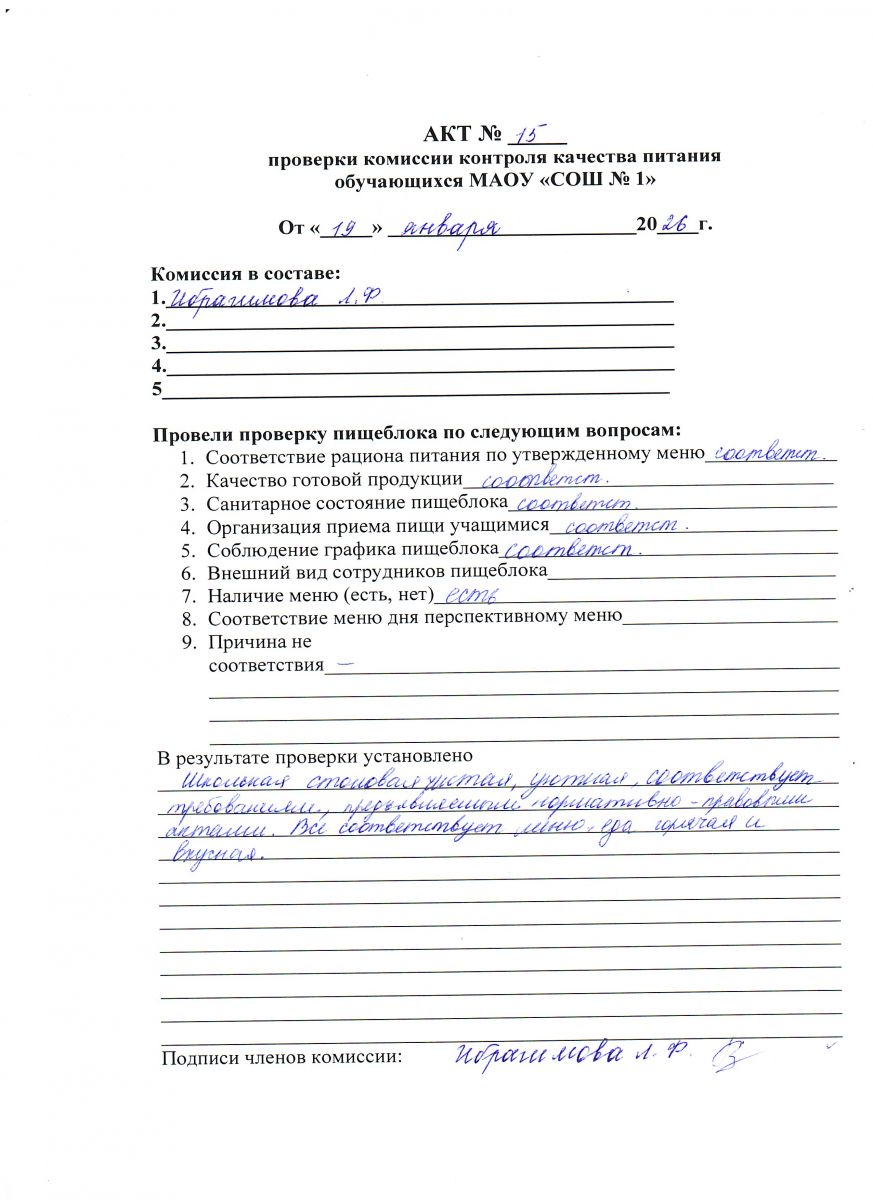 АКТ № 15 проверки комиссии контроля качества питания обучающихся МАОУ СОШ № 1