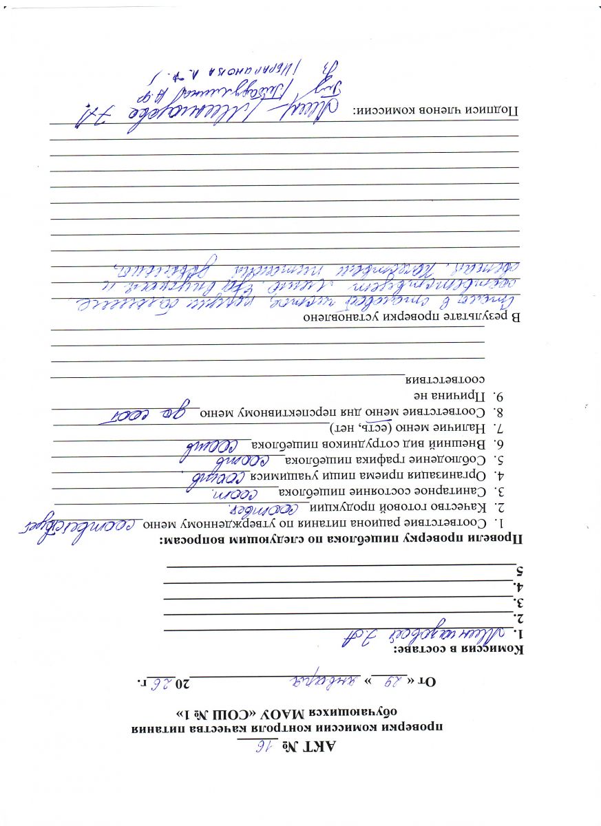 Акт № 26 проверки комиссии контроля качества питания обучающихся МАОУ СОШ № 1