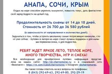 ГБУ «РЦ «Черноморец» предлагает отдых для детей и подростков в Детских оздоровительных лагерях на Черноморском побережье Краснодарского края и Республики Крым. НАШИ НАПРАВЛЕНИЯ: АНАПА, СОЧИ, КРЫМ Отдых на море способен укрепить иммунитет, повысить тонус, дать фантастический заряд бодрости на целый год. Продолжительность смены от 14 до 18 дней. Стоимость от 26 700 до 36 580 рублей (в зависимости от направления и количества дней). Задуматься о том, чтобы устроить школьнику самые потрясающие каникулы, стоит уже сейчас – путевки в лагеря на море станут лучшим подарком и для малы- ша-первоклассника, и для подростка. РЕБЯТ ЖДЕТ ЯРКОЕ ЛЕТО, ТЕПЛОЕ МОРЕ, МНОГО ТВОРЧЕСТВА, ИГР И СМЕХА! Вся необходимая для приобретения путёвки информация представлена на нашем сайте: http://ok-chernomorec.ru и в социальной сети «Вконтакте»: https://vk.com/clubokchernomorec и Instagram: okchernomoreс. Мы также готовы ответить на все вопросы по телефонам