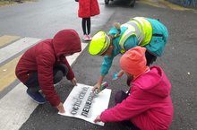 С целью профилактики ДДТП ребята отряда ЮИД провли акцию "Пешеходный переход". С помощью трафарета и краски, для превлечения внимания, оставили на асфальте надпись "Осторожно, пешеход". // Юл-транспорт һәлакәтләрен профилактикалау максаты белән ЮИД отряды балалары "Җәяүле кичүе"акциясе үткәрделәр. Трафарет һәм буяу ярдәмендә, игътибар җәлеп итү өчен, асфальтта "сак булыгыз, җәяүле"дигән язу калдырдылар.
