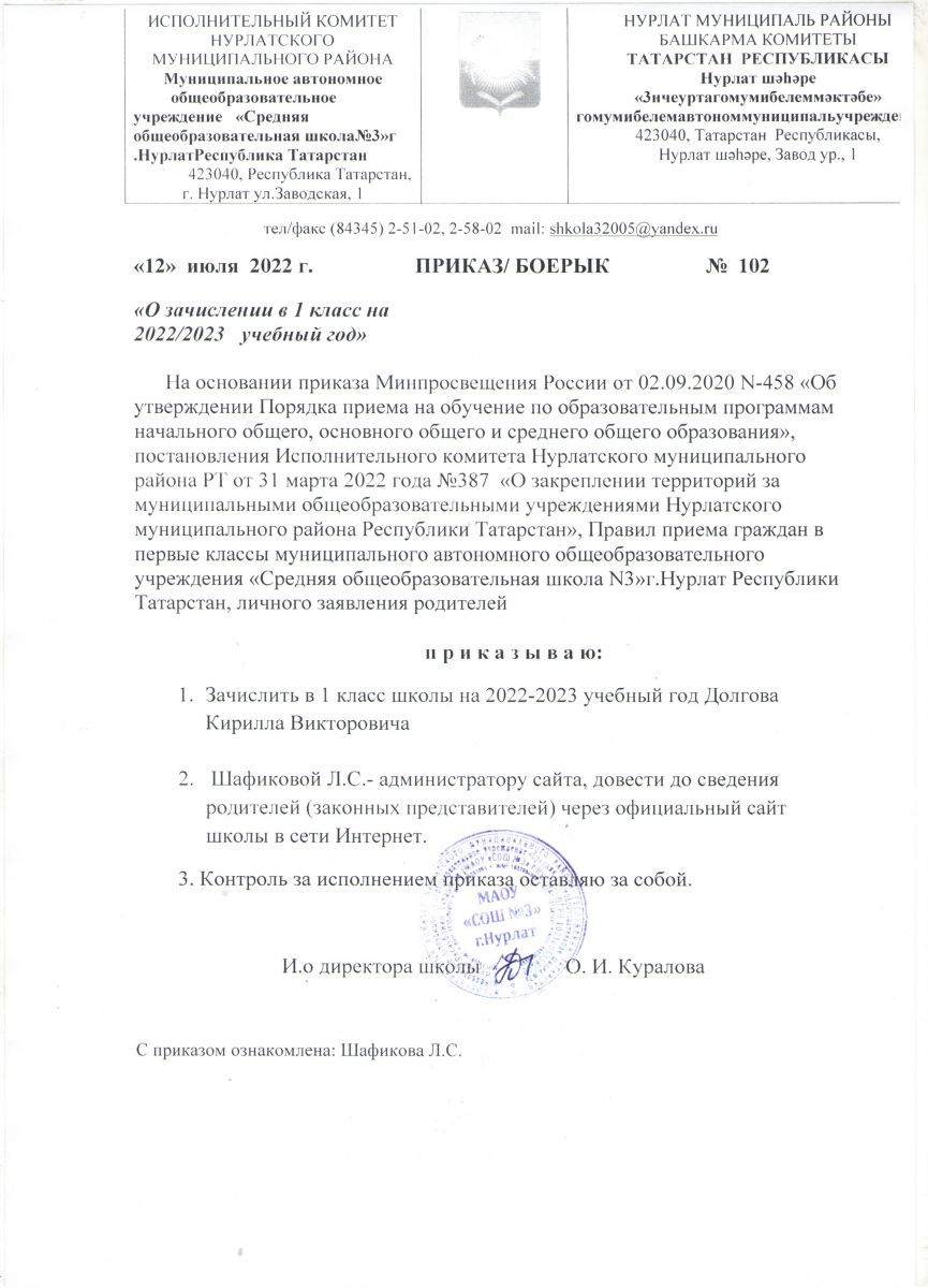 Приказ о зачислении в 1 класс на 2022-2023 уч.год № 102 от 12.07.2022 г.