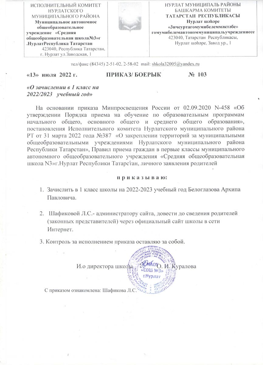 Приказ о зачислении в 1 класс на 2022-2023 уч.год № 103 от 13.07.2022 г.