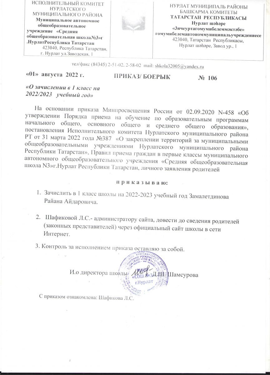 Приказ о зачислении в 1 класс на 2022-2023 уч.год № 106 от 01.08.2022 г.