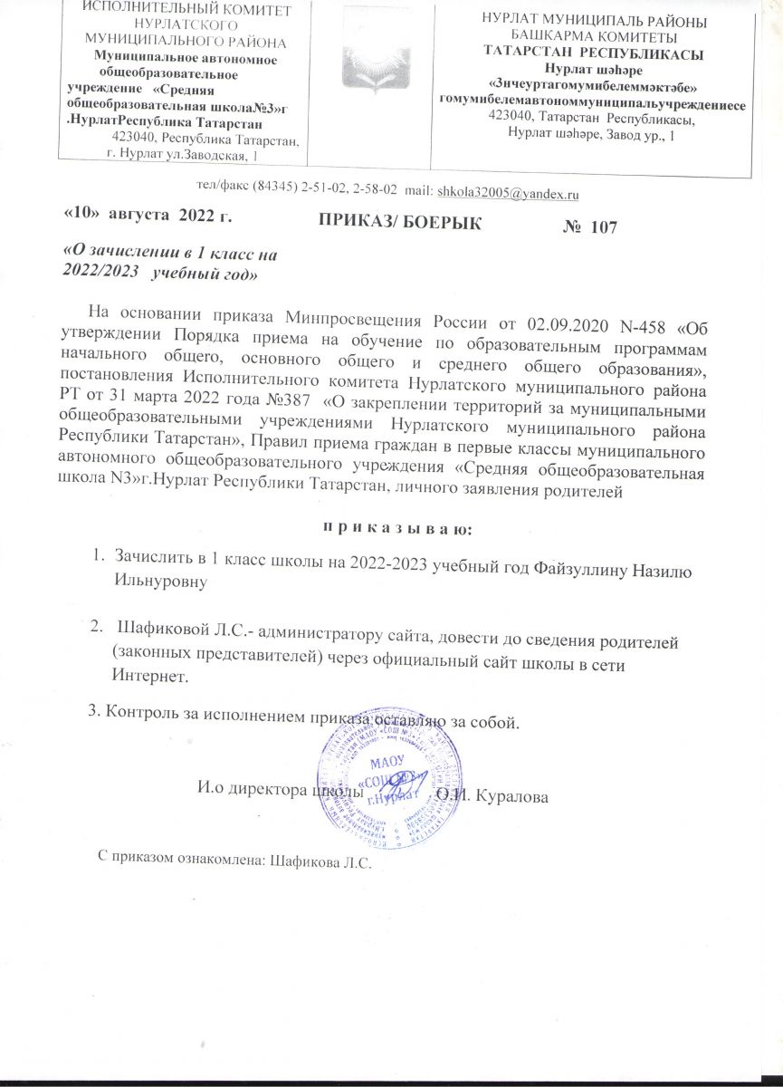 Приказ о зачислении в 1 класс на 2022-2023 уч.год № 107 от 10.08.2022 г.