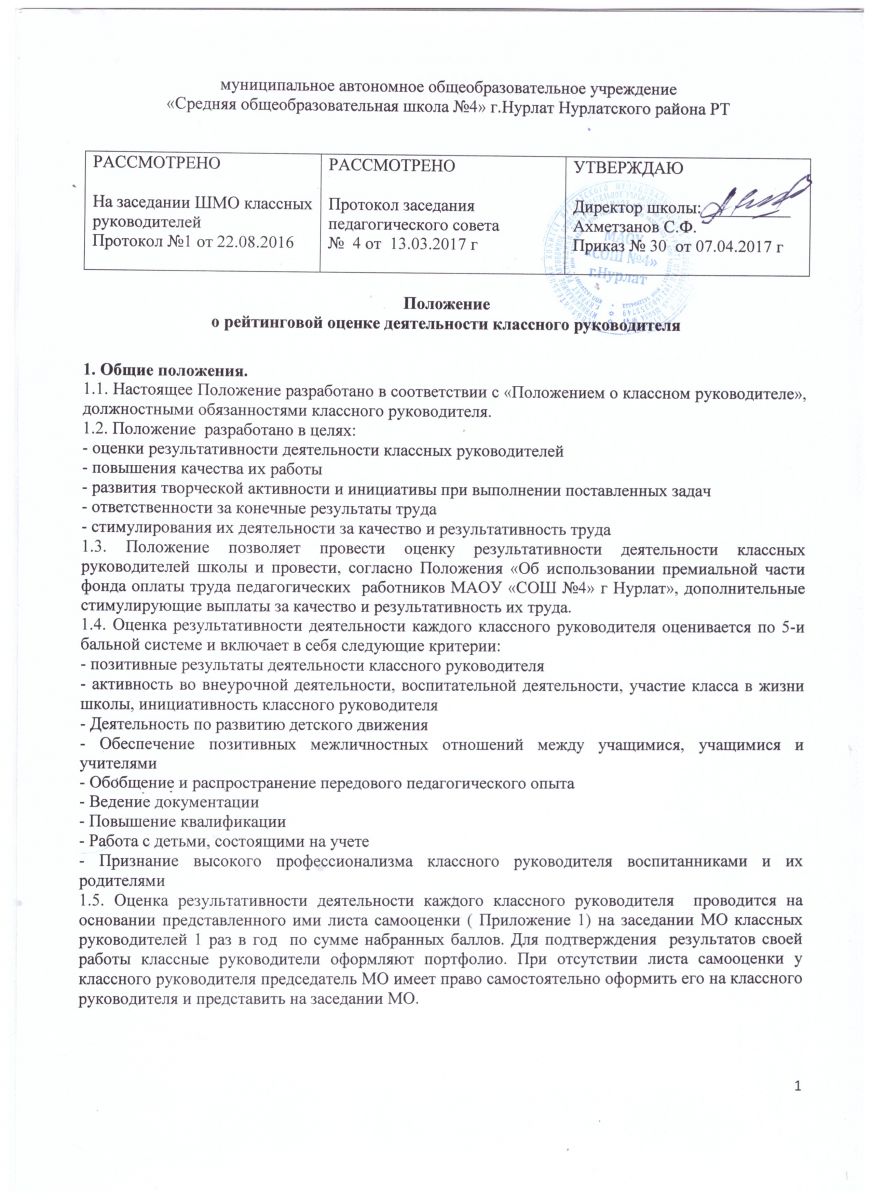 Положение о рейтинге классного руководителя