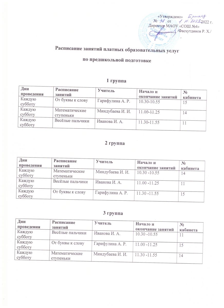 Расписание занятий платных образовательных услуг по предшкольной подготовке