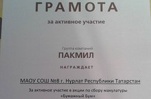 За активное участие в акции по сбору макулатуры нашу школу №8 наградили грамотой