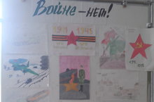 Каждый человек,посетивший нашу школу,не может не пройти мимо большой выставки с рисунками учеников.Дети каждый день пополняют стенд рисунками,посвященными 70летию Великой Победы.Здесь и танки,и самолеты,и оружие,и солдаты,сражаются за мирное небо над головами родных.Мы помним и чтим великий подвиг наших прадедов!