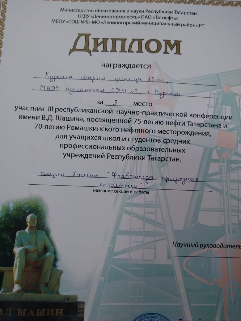 В.Д.Шашин исемендәге III Республика ФПКсендә 8б сыйныфы укучысы Куркина М.3нче урынны яулады.Фәнни җитәкчесе: Атаманова Е.В.