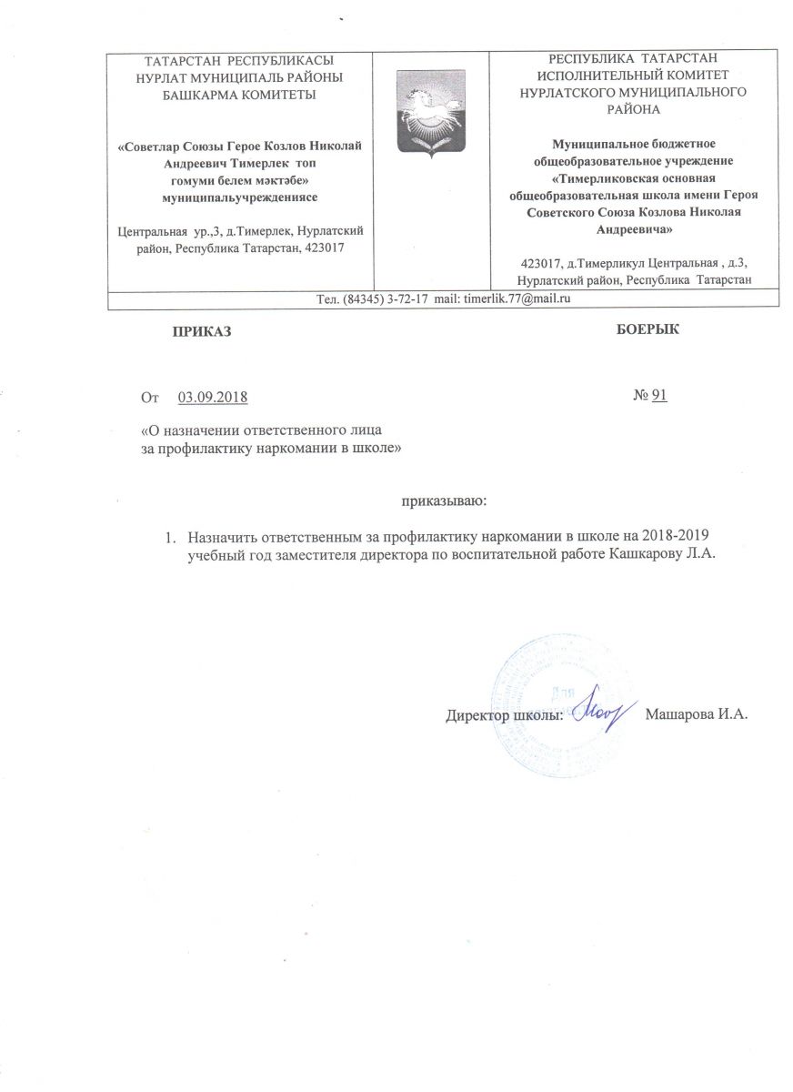 Приказ о назначении ответственного лица за профилактику наркомании в школе