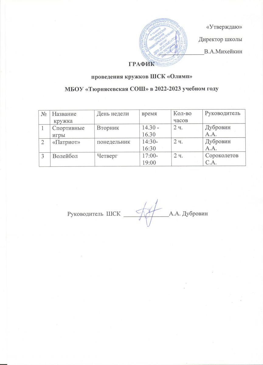 Расписание работы спортивных секций Тюрнясевской СОШ во внеурочное время в 2025-26 учебном году