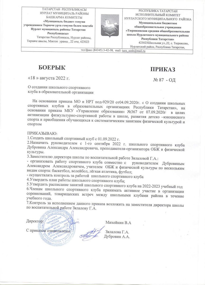 Приказ о создании школьного спортивного клуба