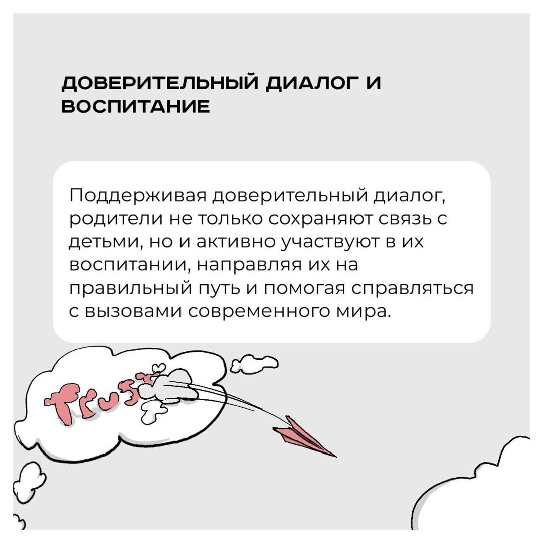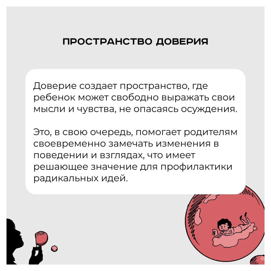 Родители, как правило, стремятся к тому, чтобы ребенок открыто делился своими мыслями которые, формируют его личность.Такие связи создают атмосферу безопасности и поддержки, что особенно важно в подростковом возрасте, когда молодежь ищет свое место в обществе.В условиях, когда радикальные идеи могут легко проникать в умы подростков, доверительный диалог становится ключевым элементом, позволяющим обсуждать сложные темы, выявлять тревожные изменения в поведении и противостоять возможному влиянию экстремистских взглядов. Пространство доверия , Предостережения от угроз , Доверительный диалог и воспитание , Доверие - это фундамент отношений.