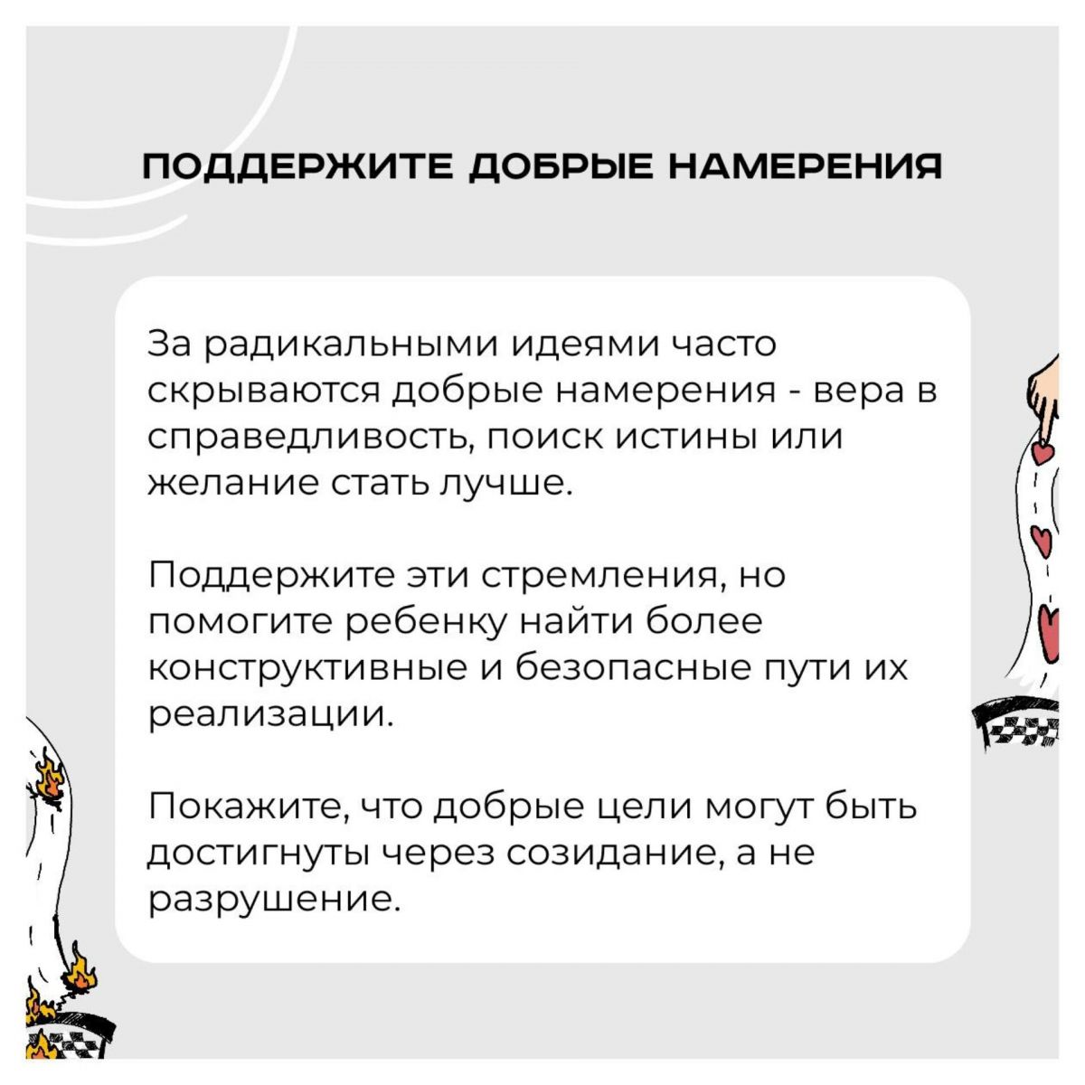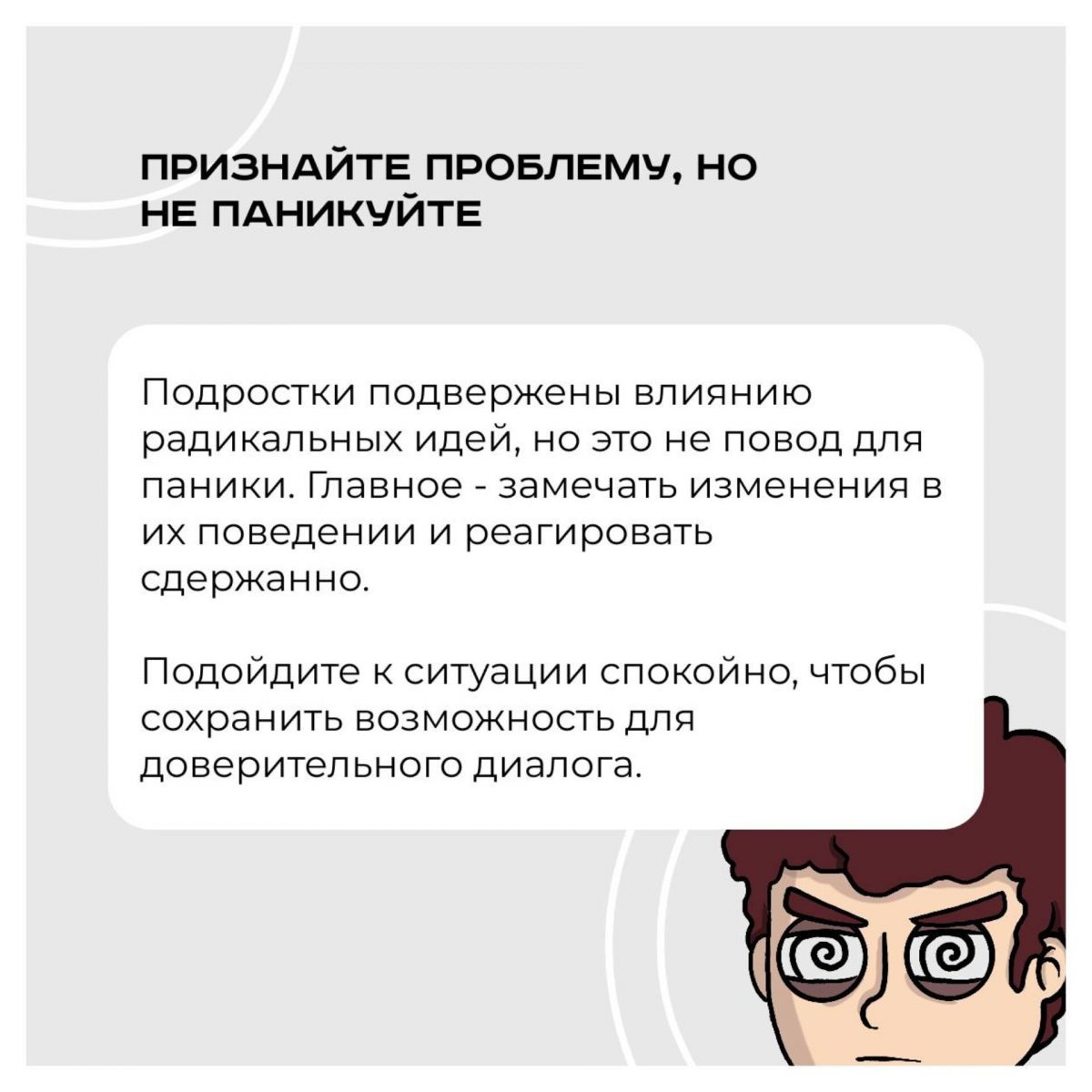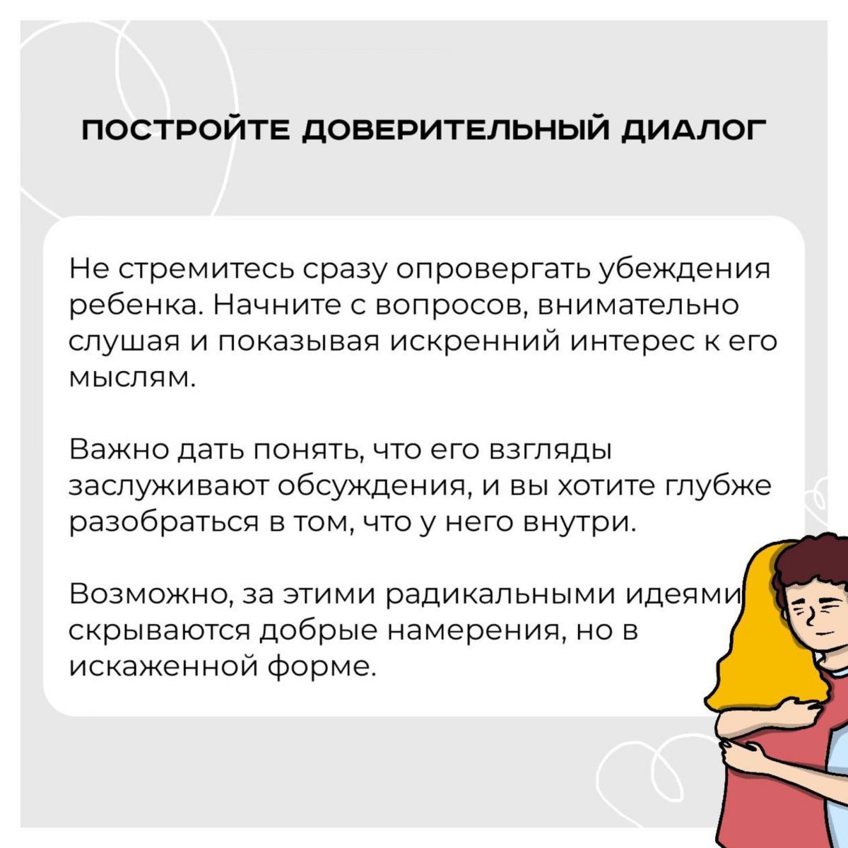 Если вы заметили, что ваш ребенок увлекся радикальными идеями, важно действовать осознанно и аккуратно.Человеческий мозг склонен упрощать сложные проблемы, что порой приводит к радикализации. Но этот процесс важно признать и преодолеть.Предлагаем несколько советов, как действовать в случае радикализации вашего воспитанника: