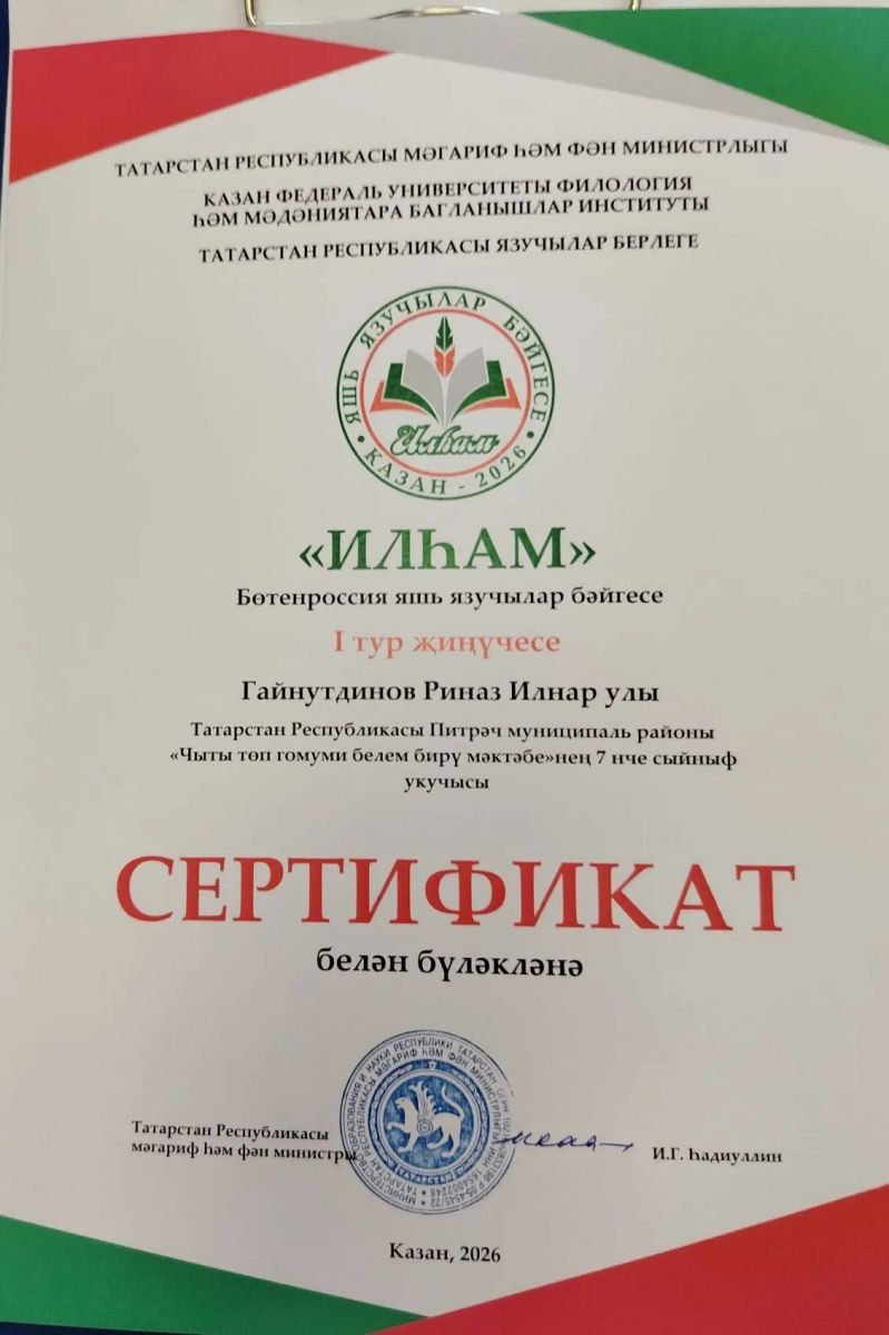 Отличные новости! Ученик 8 класса Гайнетдинов стал победителем первого тура Всероссийского конкурса молодых писателей "Илһам". Поздравляем Риназа с этим замечательным достижением и желаем дальнейших успехов в творчестве!