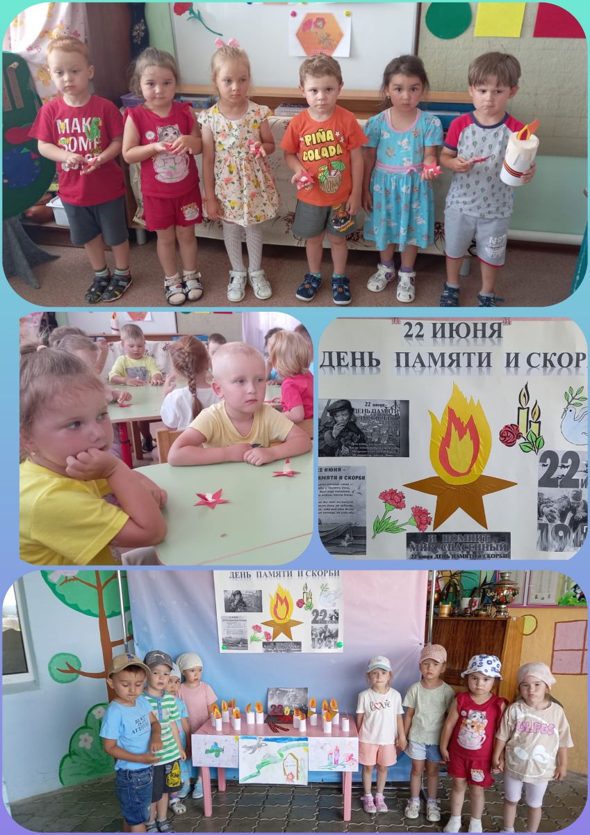 Воспитатели в доступной форме рассказали о том, что в истории каждой страны есть трагические события и даты. 22 июня - День памяти и скорби, напоминающий нам о миллионах погибших на полях сражений, замученных в фашистских лагерях, умерших от голода и лишений в годы Великой Отечественной войны, именно в этот день началась война. Самое трагическое событие в жизни людей… Начало войны 1941 года принесла с собой боль и утрату, жестокость и разрушения, страдания многих людей и, в первую очередь, детей. Как маленькие дети, наравне с взрослыми, ковали долгожданную Победу. В этот день звучали стихи и рассказы «О Родине, о мужестве, о славе».