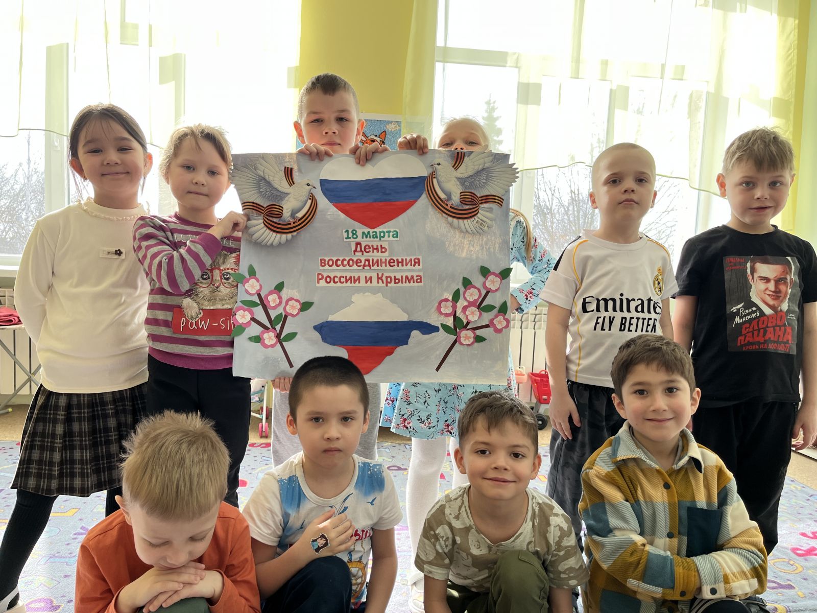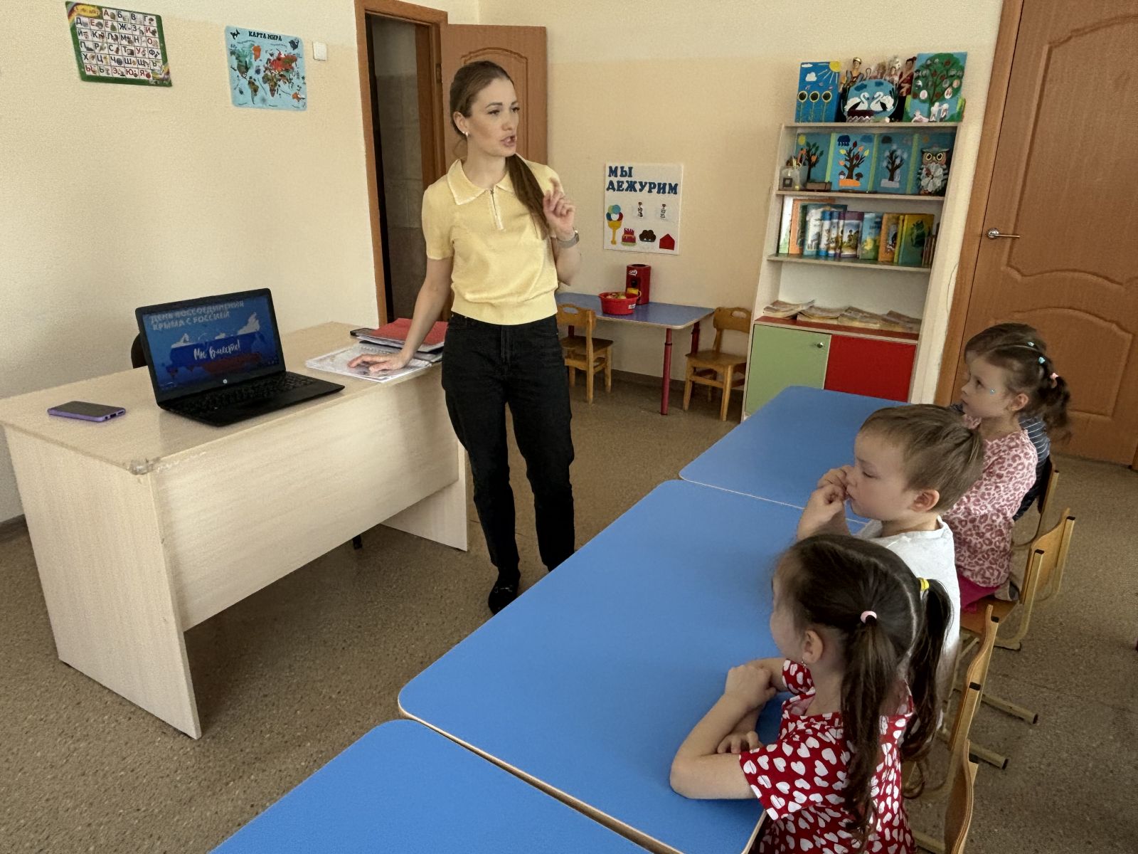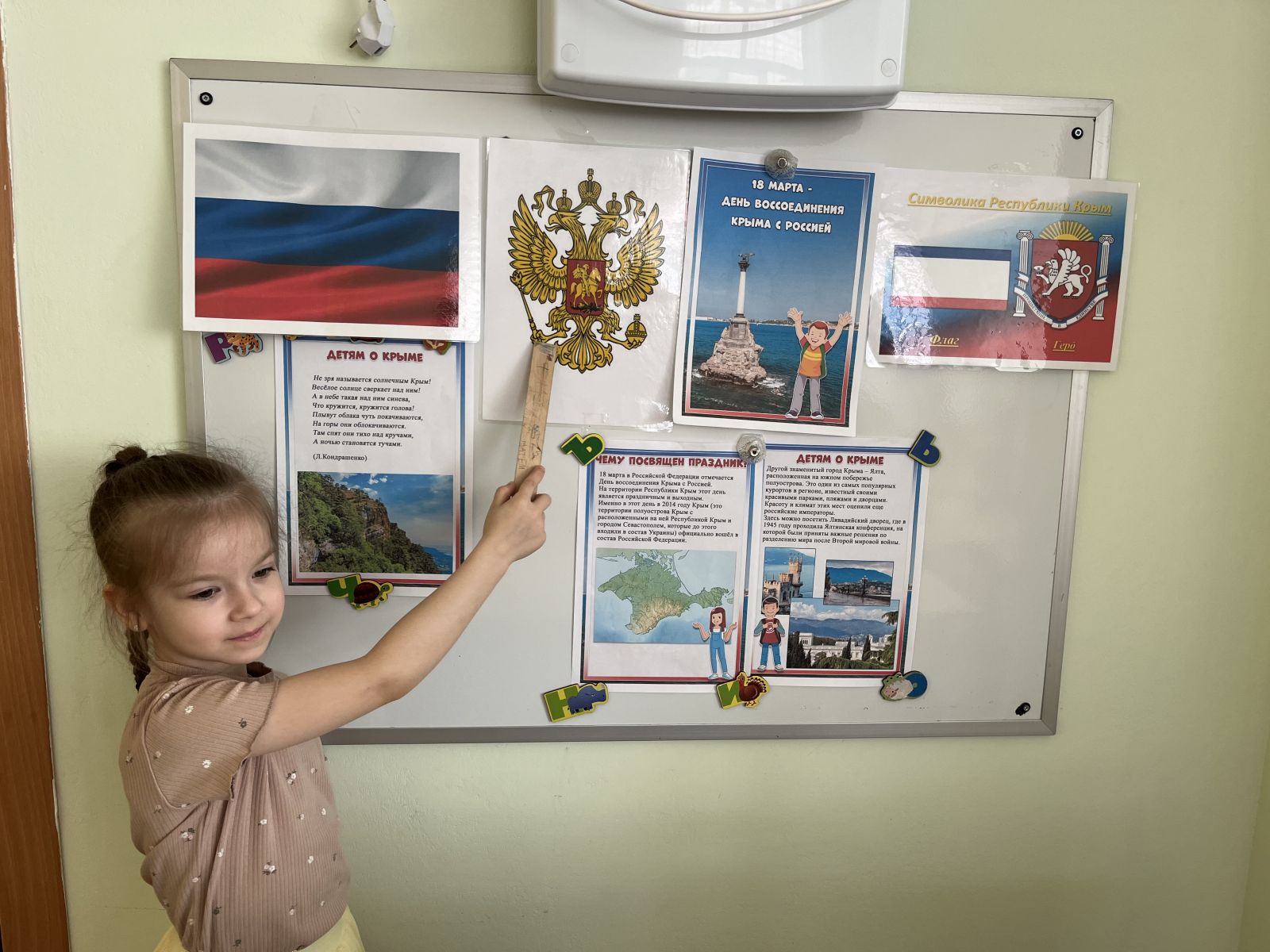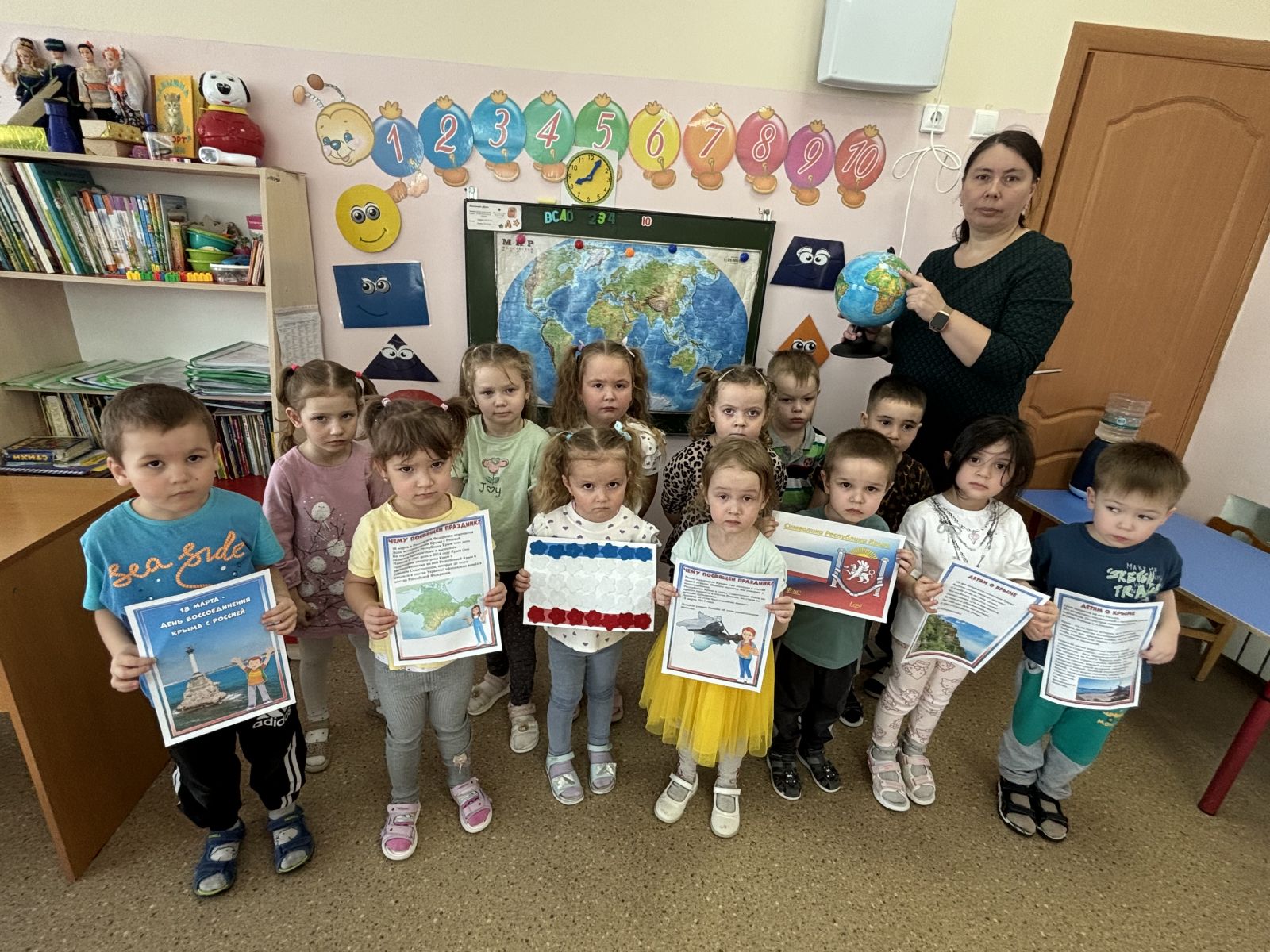 Детям была представлена презентация «Крым и Россия. Мы вместе». Они с интересом слушали рассказ воспитателя об истории Крыма, о событиях, произошедших в марте 2014 года, о достопримечательностях и природе полуострова, дети знакомились с символикой Крыма и России, изучали флаг и герб, слушали гимн Российской Федерации и Крыма.