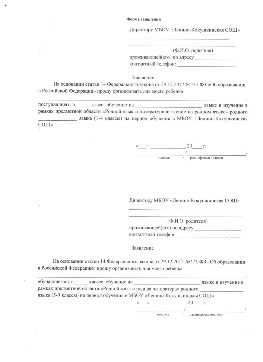 Заявление на изучения "Родной язык и литературное чтение на родном языке" для основной школы