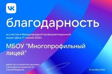 Благодарность за участие в Международной профориентационной акции "День IT -знаний 2022" 08.12.2022