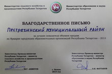 11 октября в г. Казань в Агропромышленном парке состоялась Ярмарка продукции образовательных организаций РТ - 2014., где приняли участие 8 школ районаПестречинский район был поощрен Благодарственным письмом Министерства сельского хозяйства и продовольствия Республики Татарстан за лучшие показатели объемов продаж на ярмарке продукции образовательных организаций РТ – 2014(всего были награждены 15 районов).