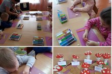 Лепка предметная по представлению "Мухомор" в младшей группе. Дети лепили гриб конструктивным способом из четырех частей ( шляпа, ножка," юбочка",полянка).