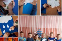 Апликация в младшей группе на тему: " Облака, тучки, дождик". Воситанники учились вырезать и клеить мелкие детали в фомре овала, полоски, тучки.