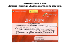 Команда школы приняла участив в республиканнском конкурсе "Лидер года- 2013" и быда удостаена дипломом в номинации "Надежда молодёжной политики"