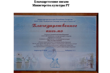 Учитель татарского языка и литературы была удостоена Благоларственным письмом Министерства культуры Республики Татарстан за активное сотрудничество и большой творческий вклад в подготовке молодых дарований. также учащиеся школы, Хаммадеев Альберт -9б класс, Хамидуллина Гульшат - 9в, Исламгараева Ильзия - 9 в класс, были удостоены образовательными сертификатами, которые дают право на льготное поступление без конкурсов, без вступительных экзаменов в "Елабужский колледж культуры и искусств". МОЛОДЦЫ!