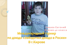 Ученик 4а класса Сиваев Евгений принял участие в Международном турнире по дзюдо "Звёздочки дзюдо в России", который проходил в г.Киров 29 октября 2011 , и завоевал 3 место.