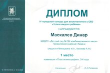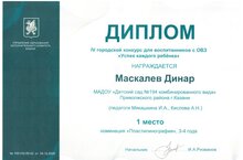 Наш воспитанник Маскалев Динар и педагоги Мякашкина И.А., Кислова А.Н. приняли участие в IV городском конкурсе для детей с ОВЗ "Успех каждого ребенка"и заняли призовое 1 место.