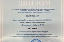 1 место в районном этапе городского конкурса "Видеовизитка образовательного учреждения. Давайте познакомимся:дошкольное образование г.Казани" 02.06.2023