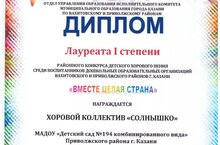 Лауреат 1 степени районного конкурса детского хорового пения среди воспитанников дошкольных образовательных организаций Вахитовского и Приволжских районов г. Казани