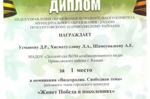 1 место в номинации "Видеоролик. Свободная тема" районного этапа городского конкурса "Живет Победа в поколениях"