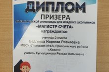 13 нче октябрь көнне, башлангыч сыйныф укучылары арасында узган математика олимпиадасында "Магистр счета" дигән номинациядә 2 нче А сыйныфы укучысы Бадгиева Нәргизә җиңү яулап, диплом белән бүләкләнде. Бу җиңүдә зур өлешен керткән сыйныф җитәкчесе Хөснетдинова Резедә Фатыховнага да зур рәхмәтебезне әйтмичә булдыра алмыйбыз! Аларга бары тик яңадан- яңа җиңүләр яуларга язсын дигән теләктә калабыз! Афәрин!!!