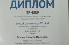 Ученик 2а класса Мусин Камиль - стал призером, очной олимпиады по окружающему миру ( учитель Насибуллина Г. Р.) WINKID (КФУ)