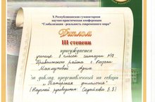 Ученица нашей гимназии Махмутова Аделя награждена Дипломом III степени за доклад, представленный на секции "Татарская филология" X Республиканской гуманитарной научно - практической конференции "Глобализация - реальность современного мира" (руководитель Садыкова З.З.)