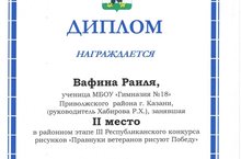 В марте 2015 года учащиеся нашей гимназии приняли участие в районном этапе III Республиканского конкурса рисунков "Правнуки рисуют Победу". По итогам конкурса былм награждены Дипломами ОУО ИКМО г.Казани по Вахитовскому иПрвиолжскому районам: Закиева Эльвира (8 класс) - III место, Вафина Раиля (7 класс) - II место. МОЛОДЦЫ!!!