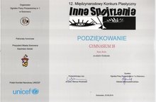 Весной 2014 года 18 учащихся нашей гимназии приняли участие в ХII Международном художественном конкурсе «Другим взглядом» ((Innә Spojrzәniә) “Волшебное место” – ПОЛЬША). По итогам конкурса наша гимназия получила Сертификат участника.