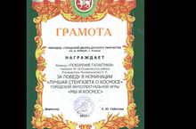 Команда учащихся гимназии «Покорение галактики» (руководитель Мухамедьярова Л.Р.) награждена ПОЧЕТНОЙ ГРАМОТОЙ ДОД «Городской дворец детского творчества им. А.Алиша» г.Казани за победу а номинации «Лучшая стенгазета о космосе» Городской интеллектуальной игры «Мы и космос»